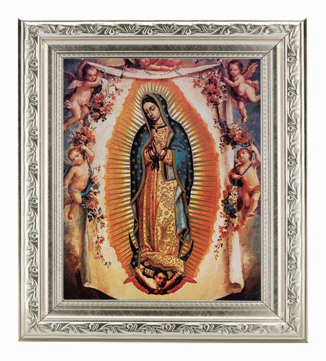 Our Lady OF Guadalupe IN Ornate Silver Frame 10-inch X 12-inch Overall Dimensions. 1-3/8-inch Wide Facing to Fit an 8-inch x 10-inch Italian Lithograph Under Glass. This Our Lady Of Guadalupe In Ornate Silver Frame measuring 10-inches by 12-inches, with the print measuring 8-inches by 10-inches, features the Catholic Shop.commoney-back guarantee.