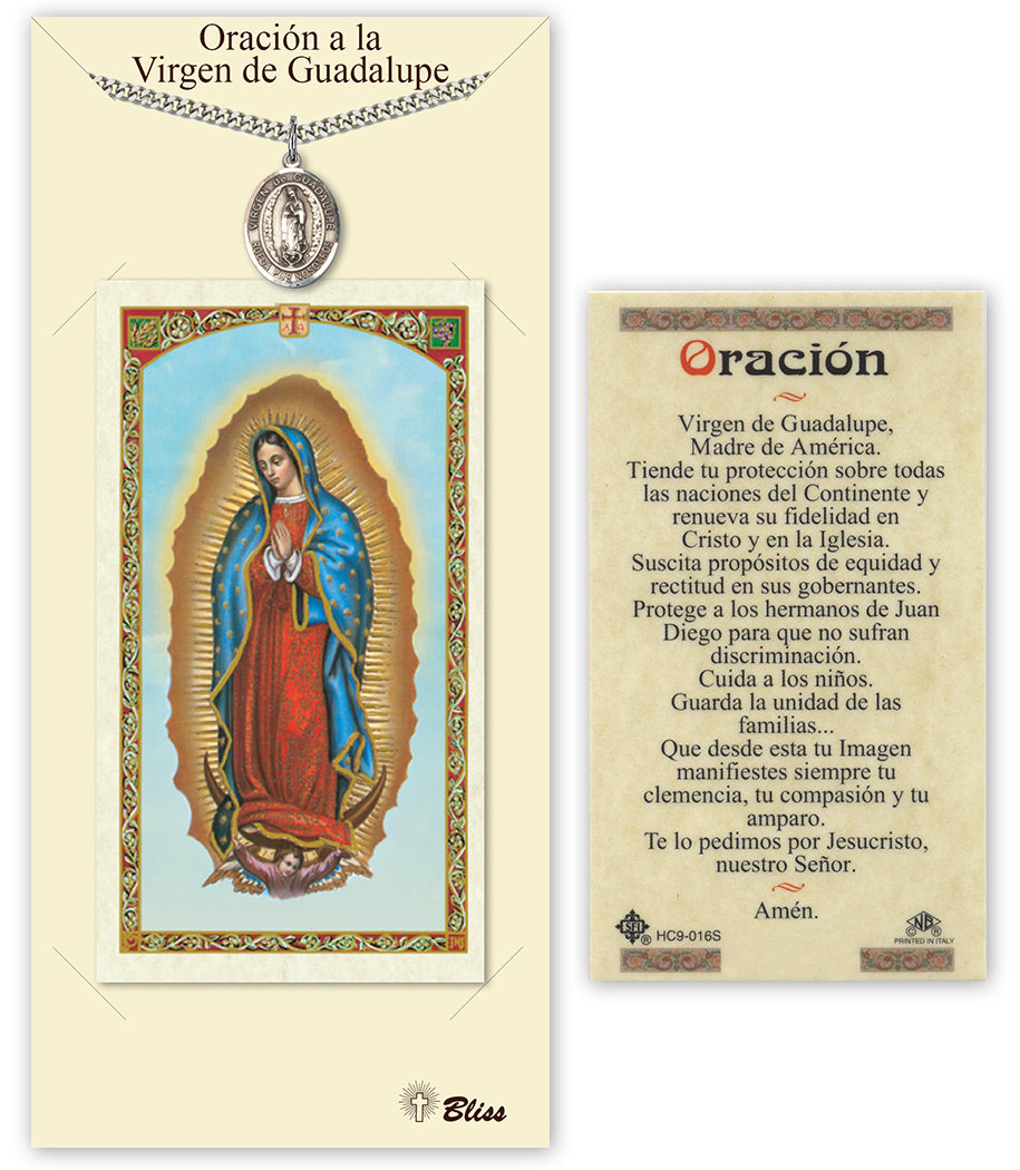Pewter Virgen de Guadalupe Medal Necklace with Our Lady of Guadalupe - Oracion Prayer Card