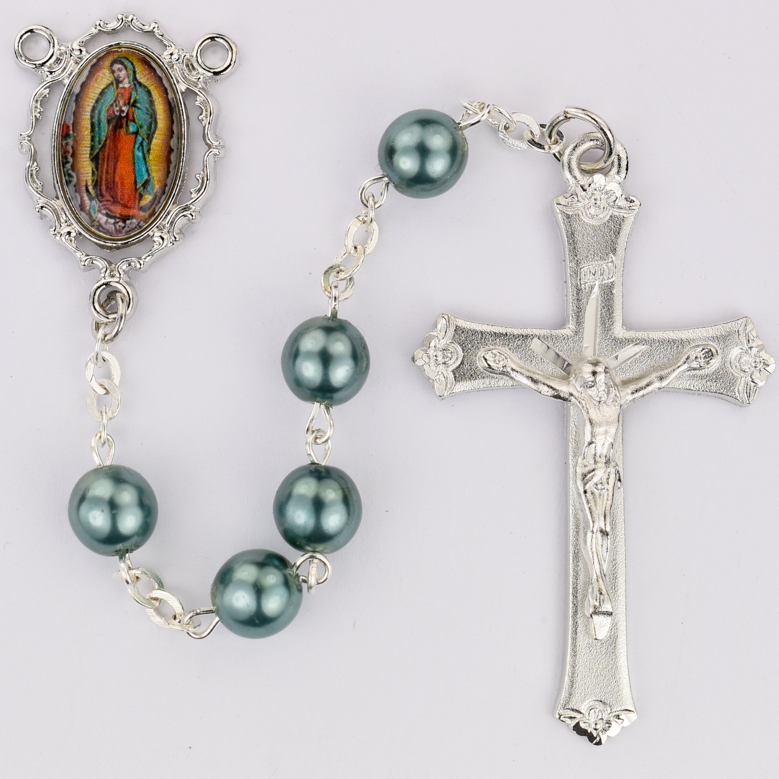 7mm Teal pearl glass beads, rhodium plated pewter crucifix and decal Our Lady of Guadalupe center, boxed