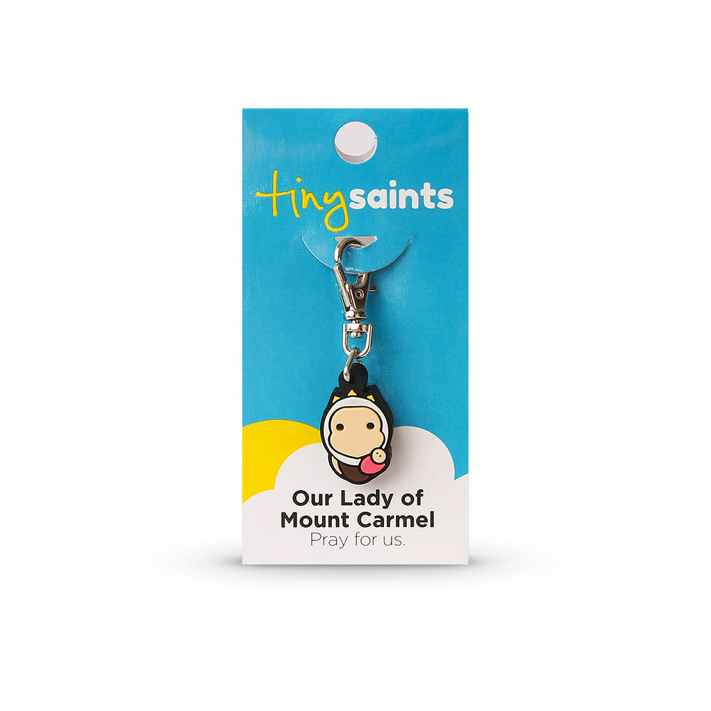 This Our Lady of Mount Carmel Tiny Saint charm can be clipped on to apparel, backpacks, necklaces, bracelets, keychains and anything you can imagine! About the size of a penny, it's made of soft, rubbery PVC and is super-durable.