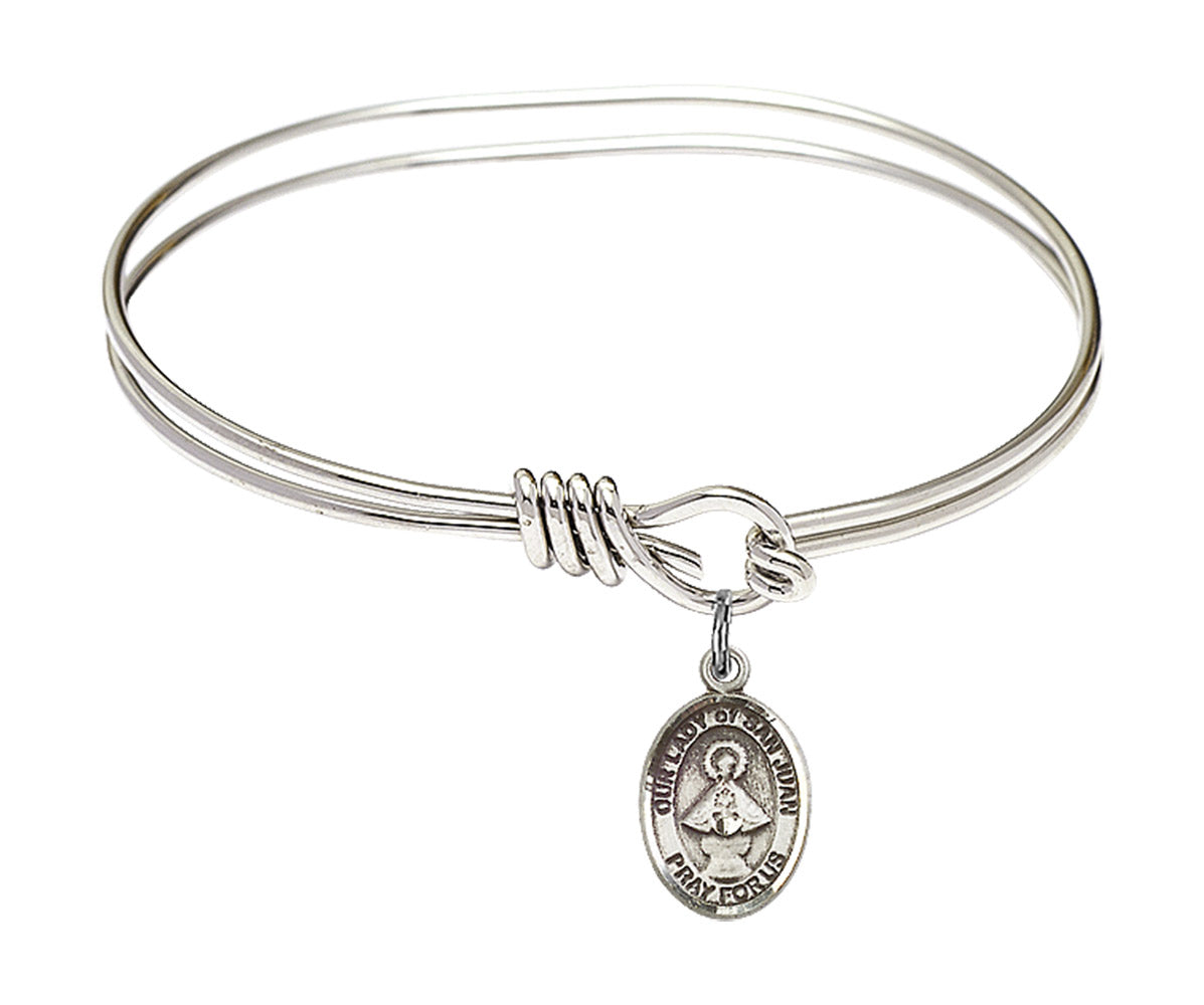 Our 5 3/4 inch Oval Eye Hook Rhodium Bangle Bracelet with a Sterling Silver Our Lady of San Juan charm. is proudly manufactured in the USA.