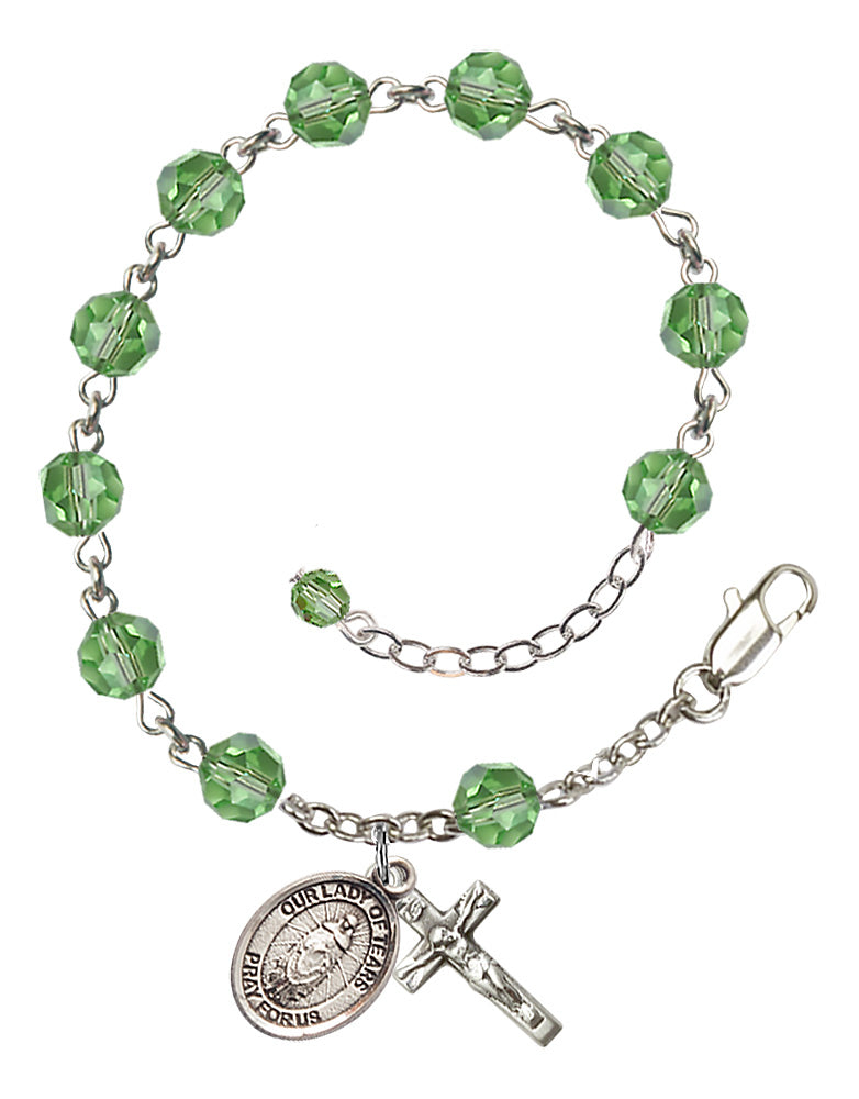 Sterling Silver 6mm Austrian Crystal Our Lady of Tears Rosary Bracelet in Peridot | Engravable