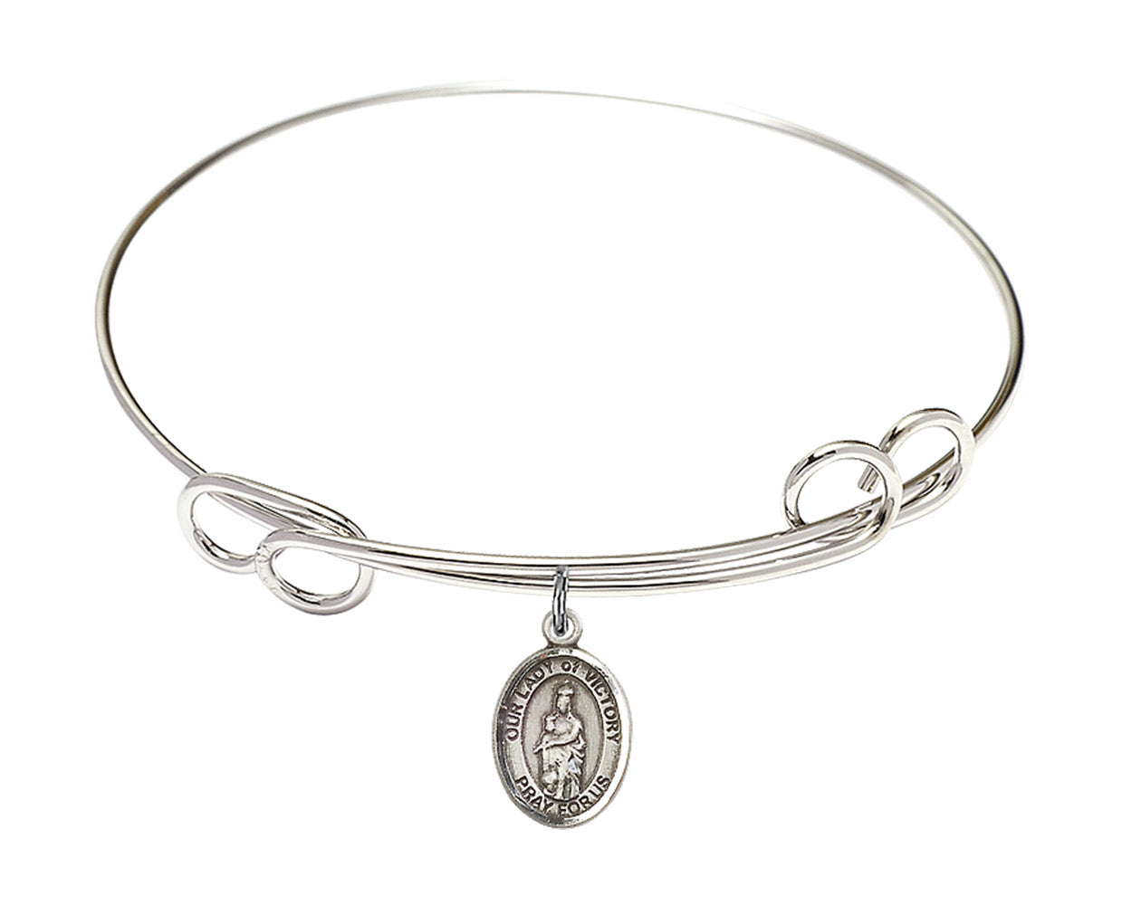 Our 7 1/2 inch Round Double Loop Rhodium Bangle Bracelet with a Sterling Silver Our Lady of Victory charm. is proudly manufactured in the USA.