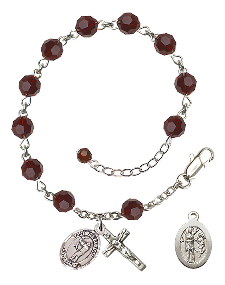Adjustable Sterling Silver 6mm Austrian Crystal St. Sebastian Archery Rosary Bracelet in Garnet