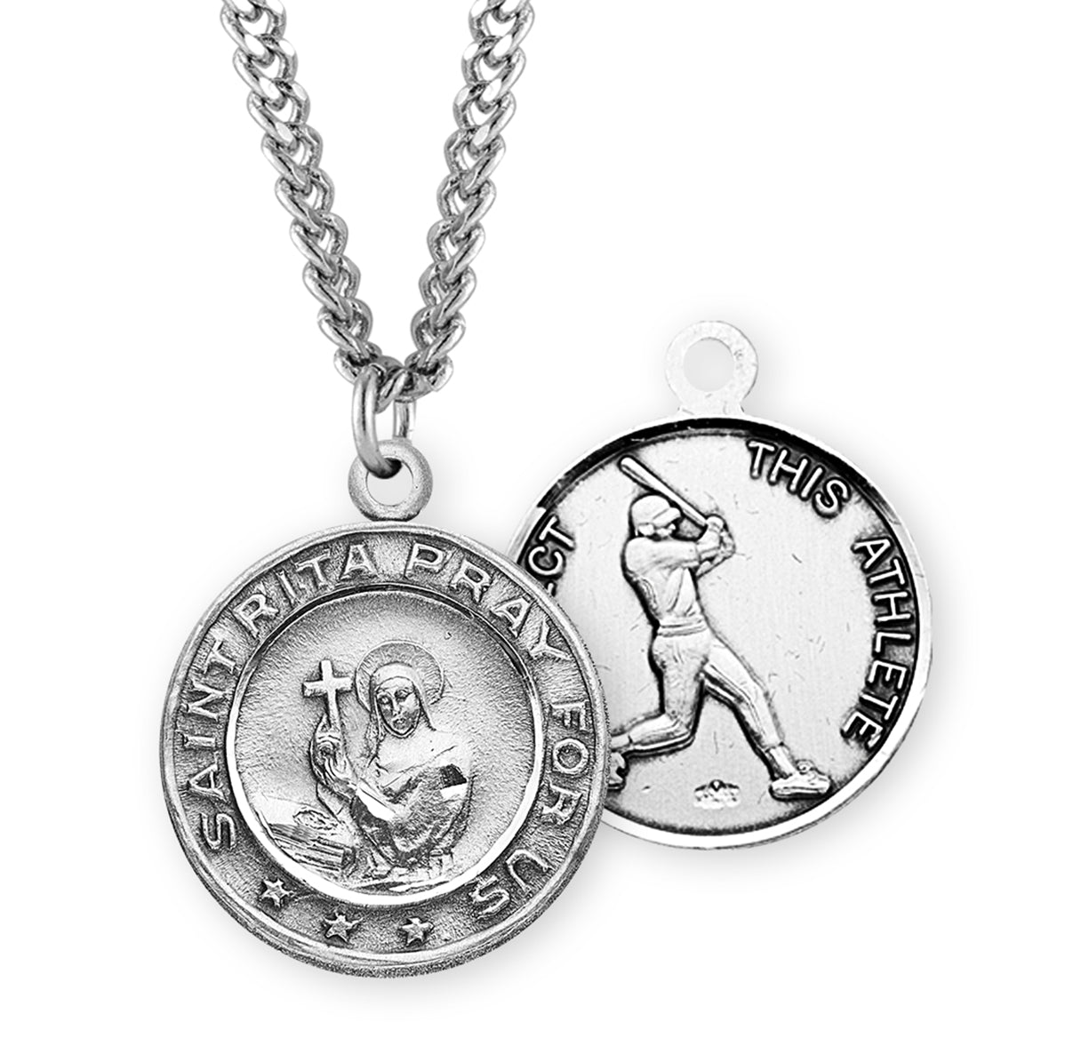 15/16-inch Sterling Silver St. Rita Medal, made in the USA. The Round Medal is adorned with St. Rita As seen in Hit Movie "The Rookie". The reverse side of the Medal Portrays a male Baseball Player.