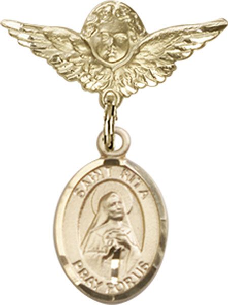 14kt Gold St. Rita / Baseball charm measures 1/2 x 1/4 inches 14kt Gold Small Angel w/Wings Badge Pin measures 3/8 x 3/4 inches Presented in a deluxe gift box