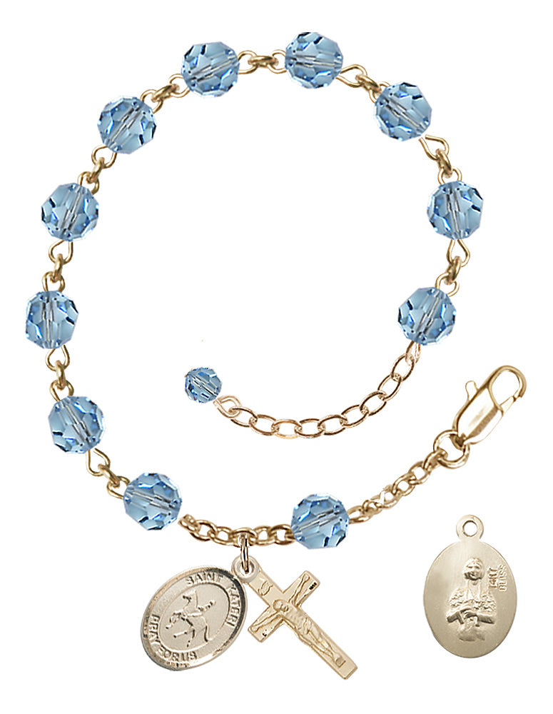 Our Adjustable 14 Karat Gold 6mm-bead Austrian Crystal Saint Kateri/Equestrian Rosary Bracelet in Aqua is handmade in the USA.
