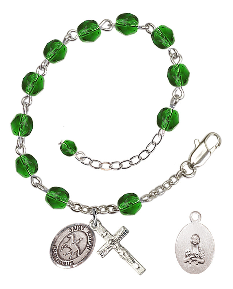 Our Adjustable Silver Plated 6mm-bead Fire Polished Saint Kateri/Equestrian Rosary Bracelet in Emerald is handmade in the USA.