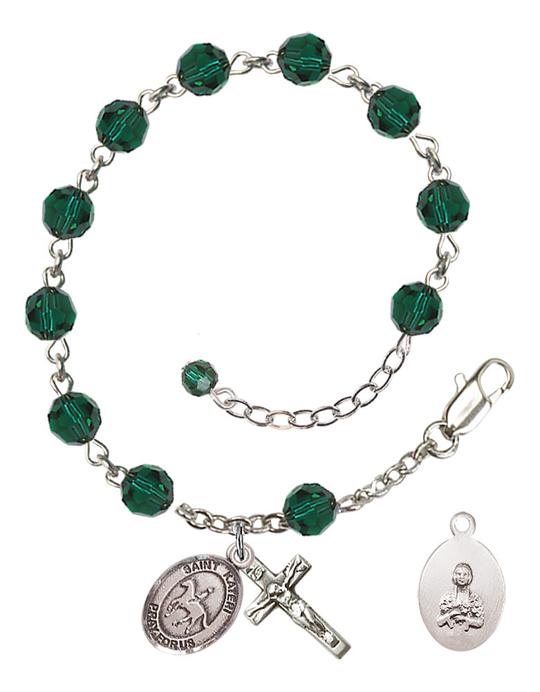 Our Adjustable Sterling Silver 6mm-bead Austrian Crystal Saint Kateri/Equestrian Rosary Bracelet in Emerald is handmade in the USA.