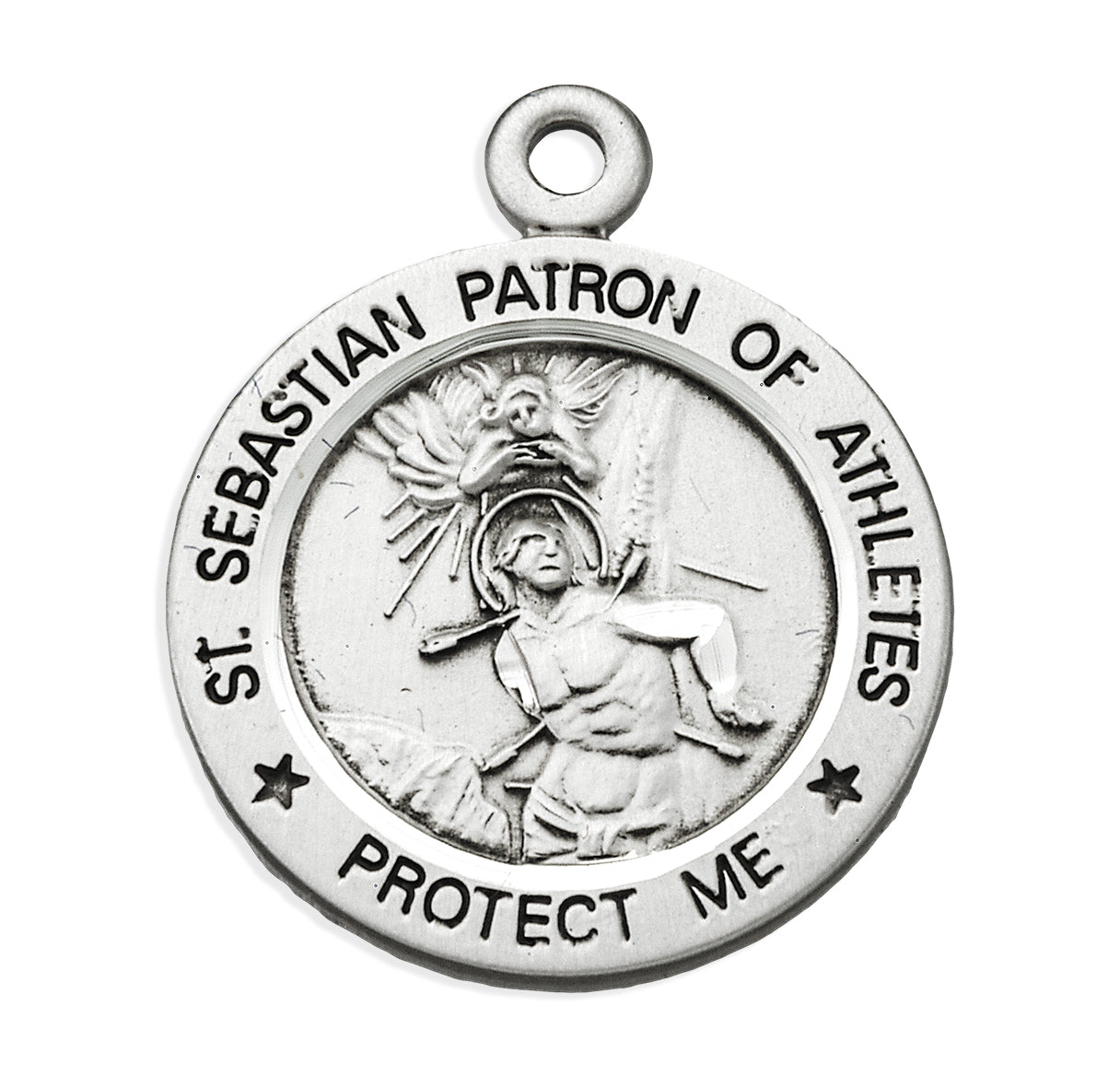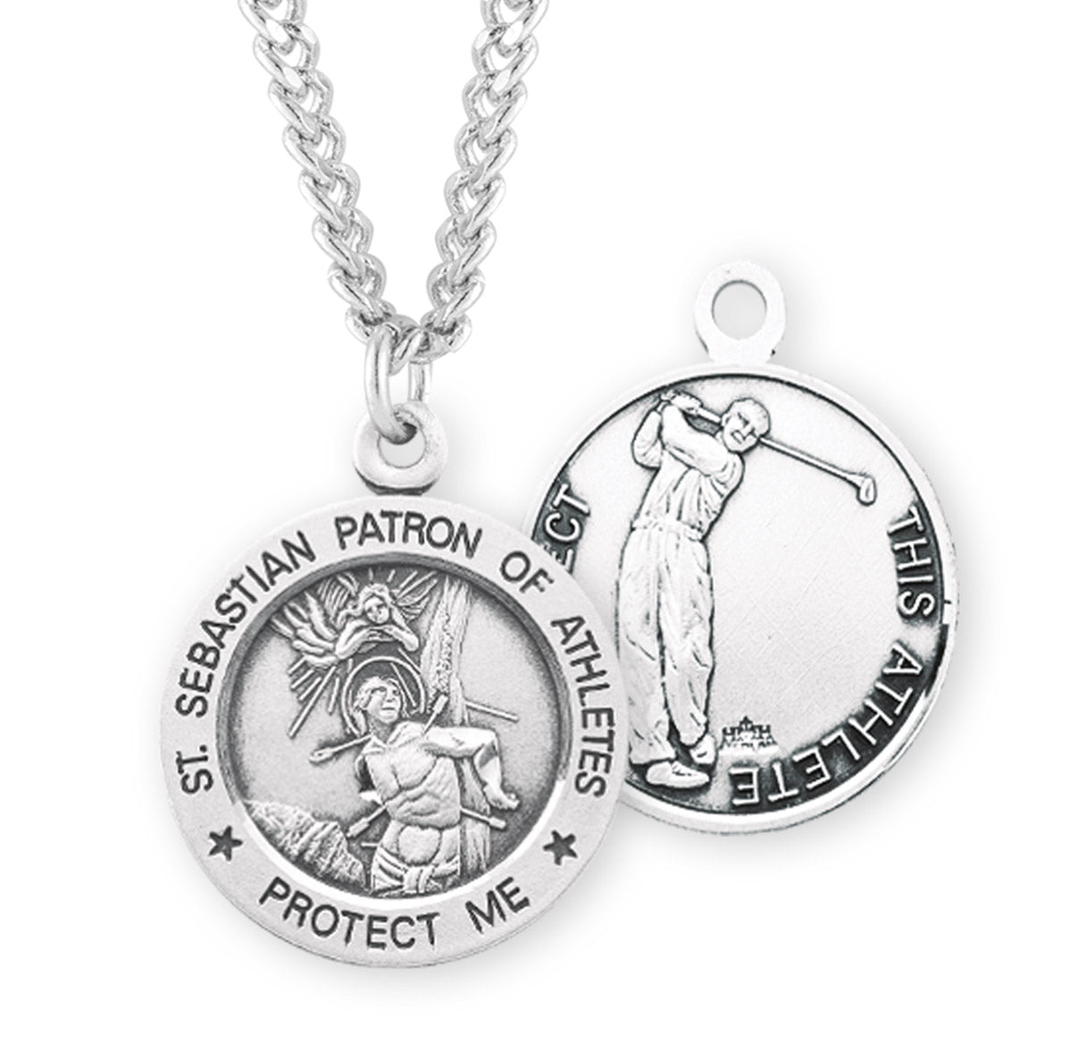 15/16-inch Sterling Silver St. Sebastian Golf Medal, made in the USA. The Round Medal is adorned with St. Sebastian the Patron Saint of Athletes. The reverse side of the Medal Portrays a Male Golfer.