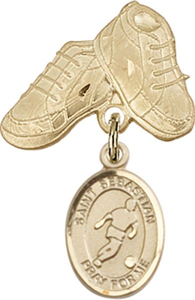 14kt Gold Filled St. Sebastian/Soccer charm measures 1/2 x 1/4 inches 14kt Gold Filled Baby Boots Badge Pin measures 1/2 x 5/8 inches Presented in a deluxe gift box