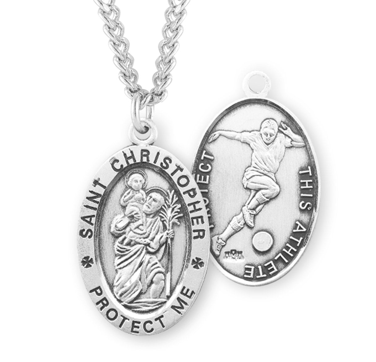 1-1/16-inch Sterling Silver St. Christopher Soccer Medal made in the USA. The Oval Medal is adorned with St. Christopher carrying the Infant Jesus. The reverse side of the Medal Portrays a Male Soccer Player.