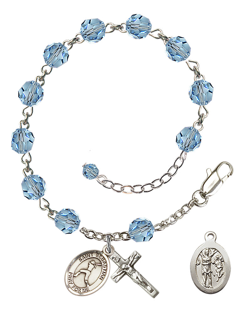 Sterling Silver 6mm Austrian Crystal St. Sebastian Softball Rosary Bracelet in Aqua | Engravable