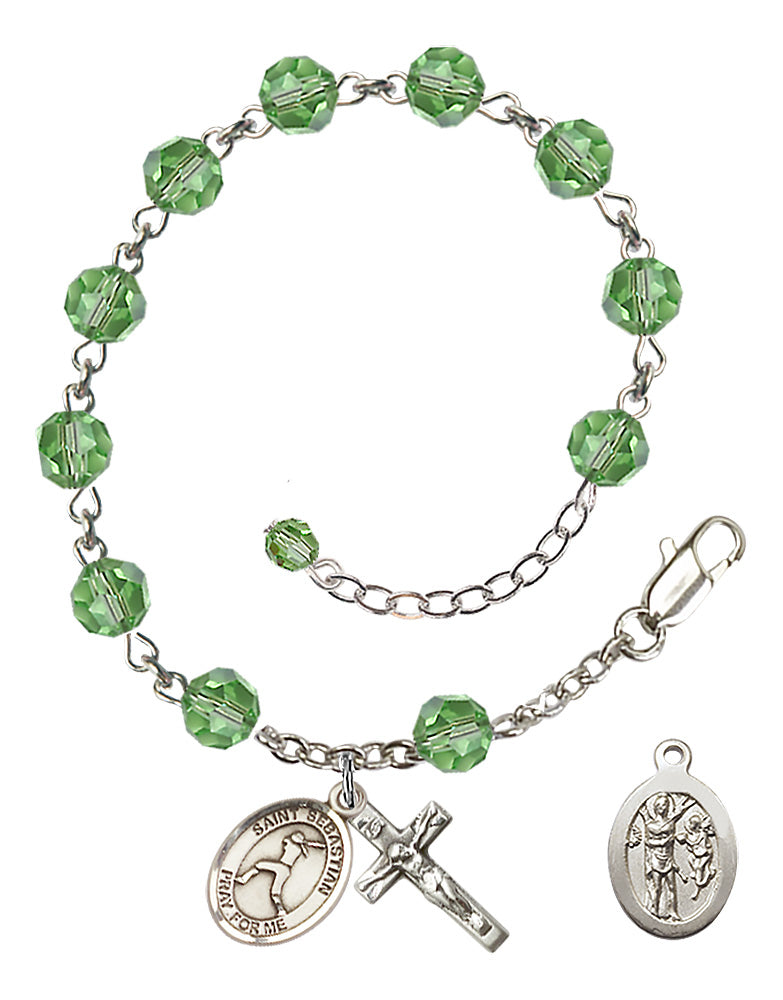 Sterling Silver 6mm Austrian Crystal St. Sebastian Softball Rosary Bracelet in Peridot | Engravable