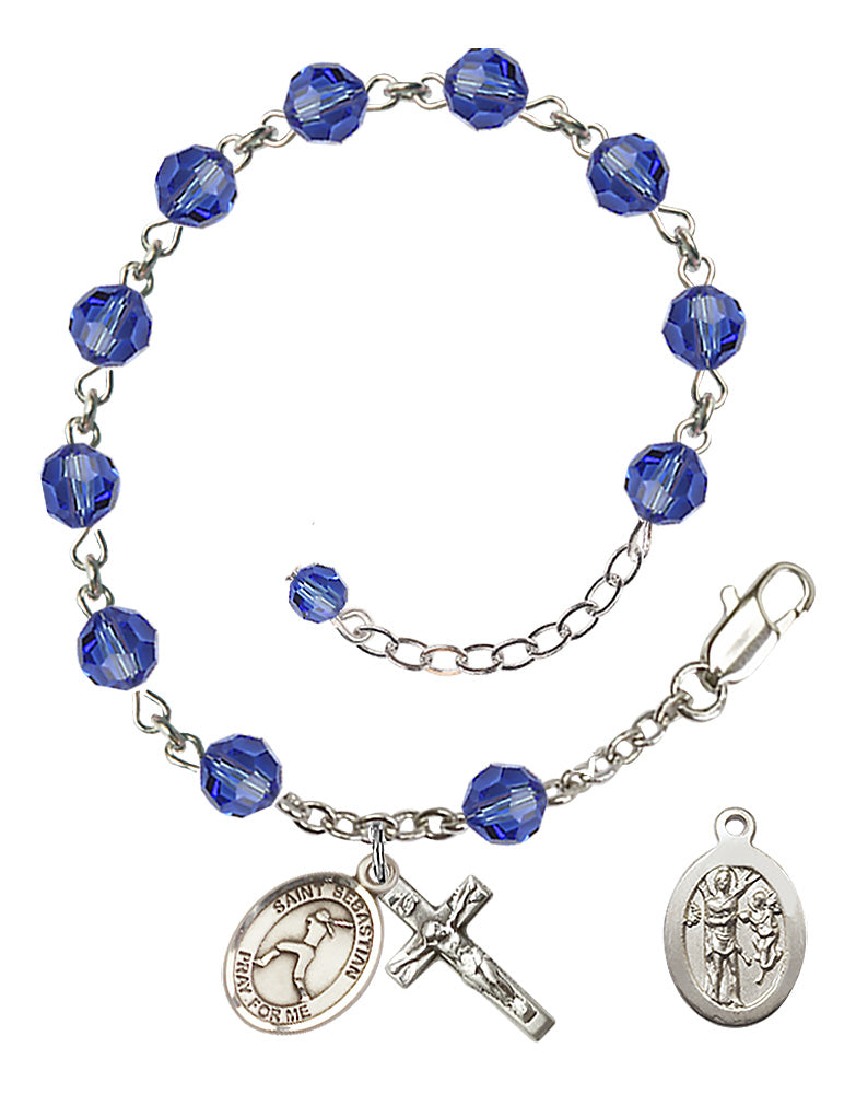 Sterling Silver 6mm Austrian Crystal St. Sebastian Softball Rosary Bracelet in Sapphire | Engravable