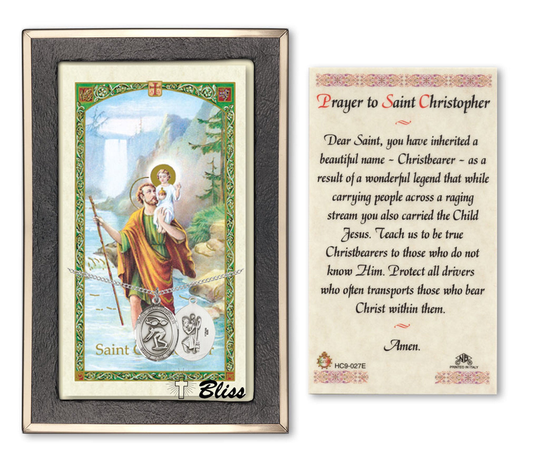 The medium-sized Saint Christopher/Swimming Medal with Prayer Card will arrive in a deluxe jewelry box, ready to wear or give as a gift.