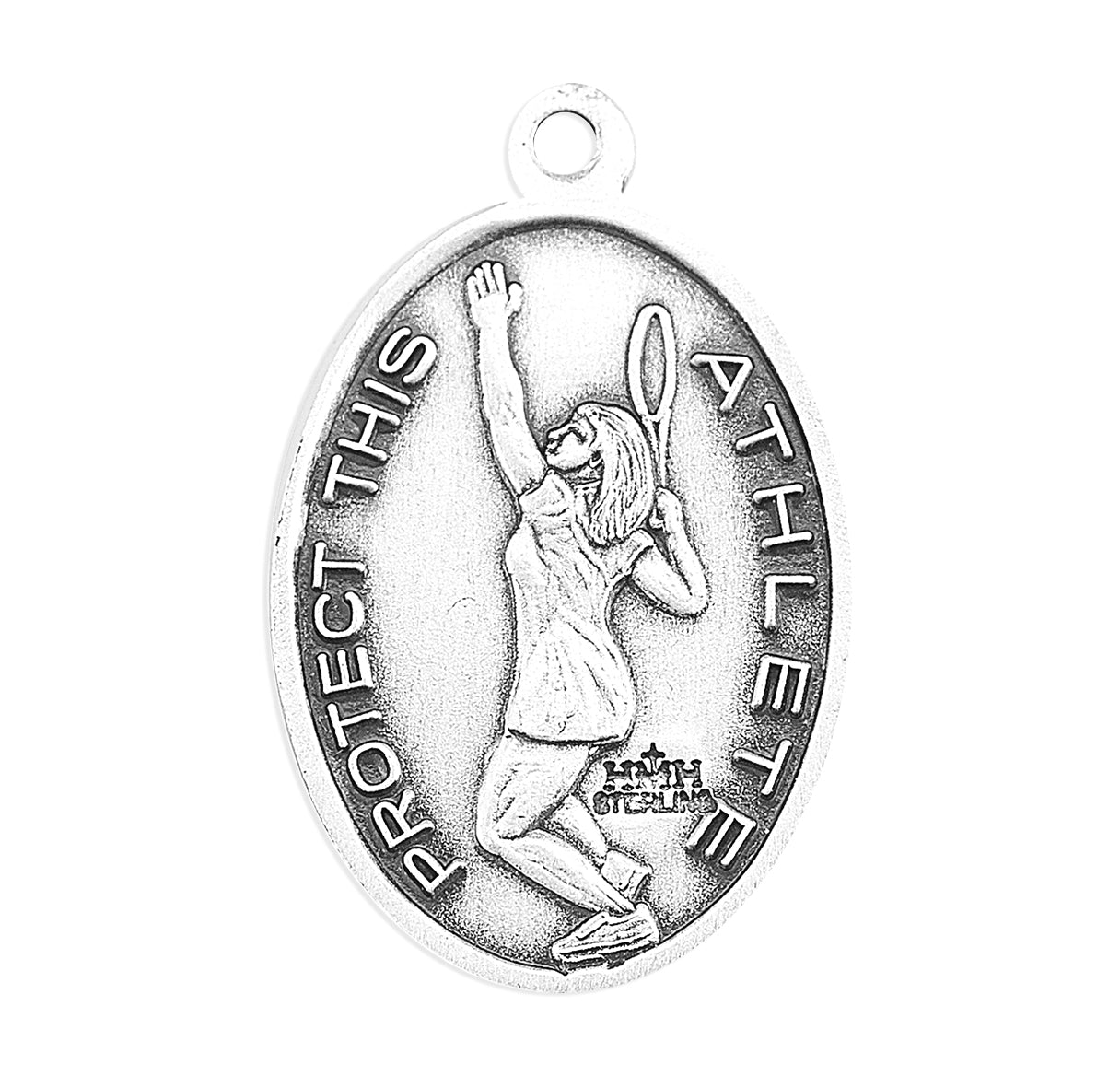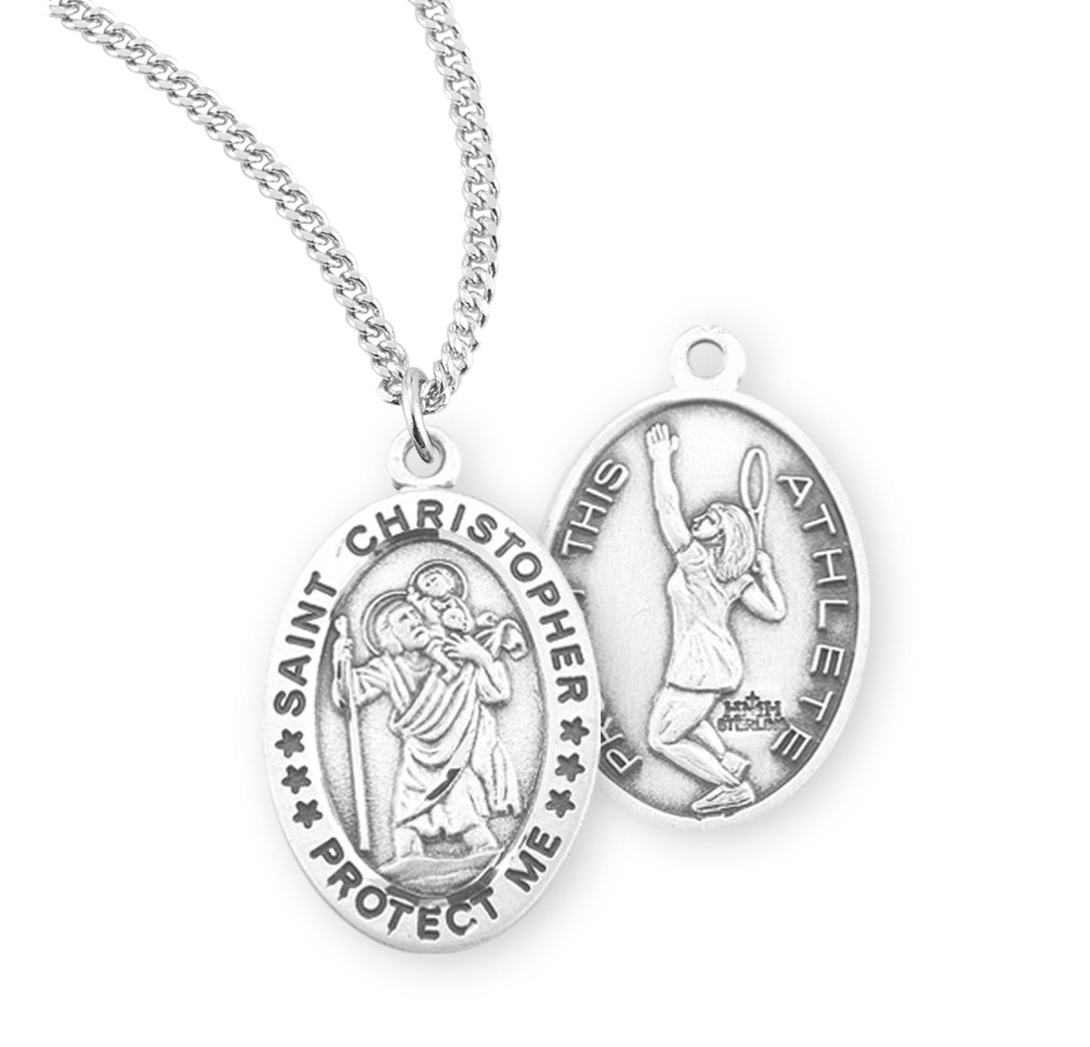 9/16-inch Sterling Silver St. Christopher Tennis Medal made in the USA. The Oval Medal is adorned with St. Christopher carrying the Infant Jesus. The reverse side of the Medal Portrays a Female Tennis Player.