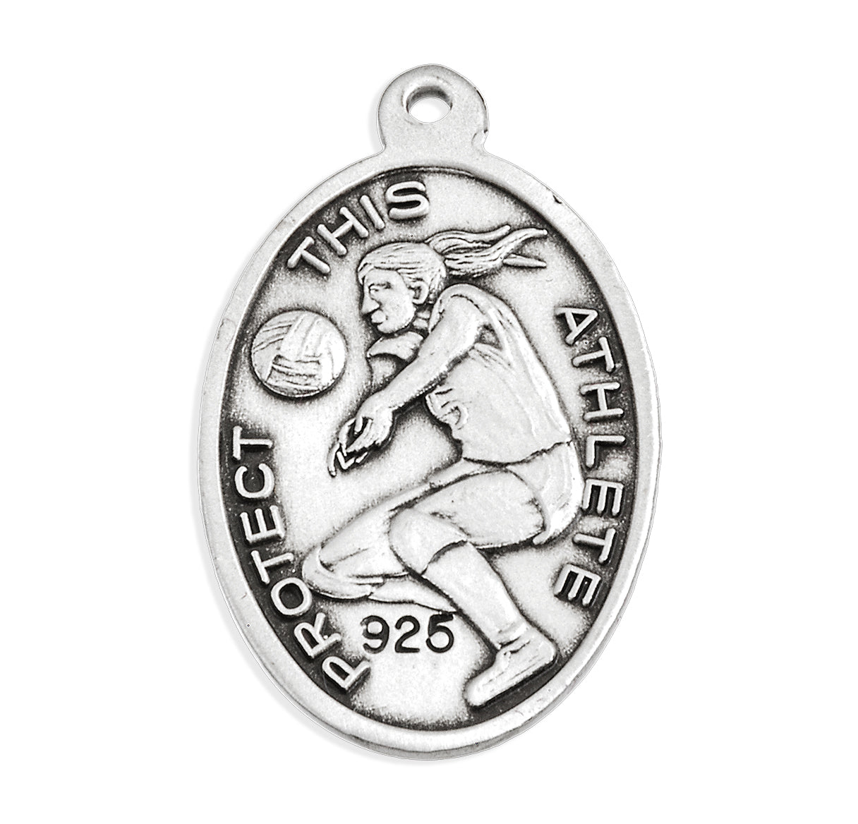9/16-inch Sterling Silver St. Sebastian Volleyball Medal made in the USA. The Oval Medal is adorned with St. Sebastian the Patron Saint of Athletes. The reverse side of the Medal Portrays a Female Volleyball Player.