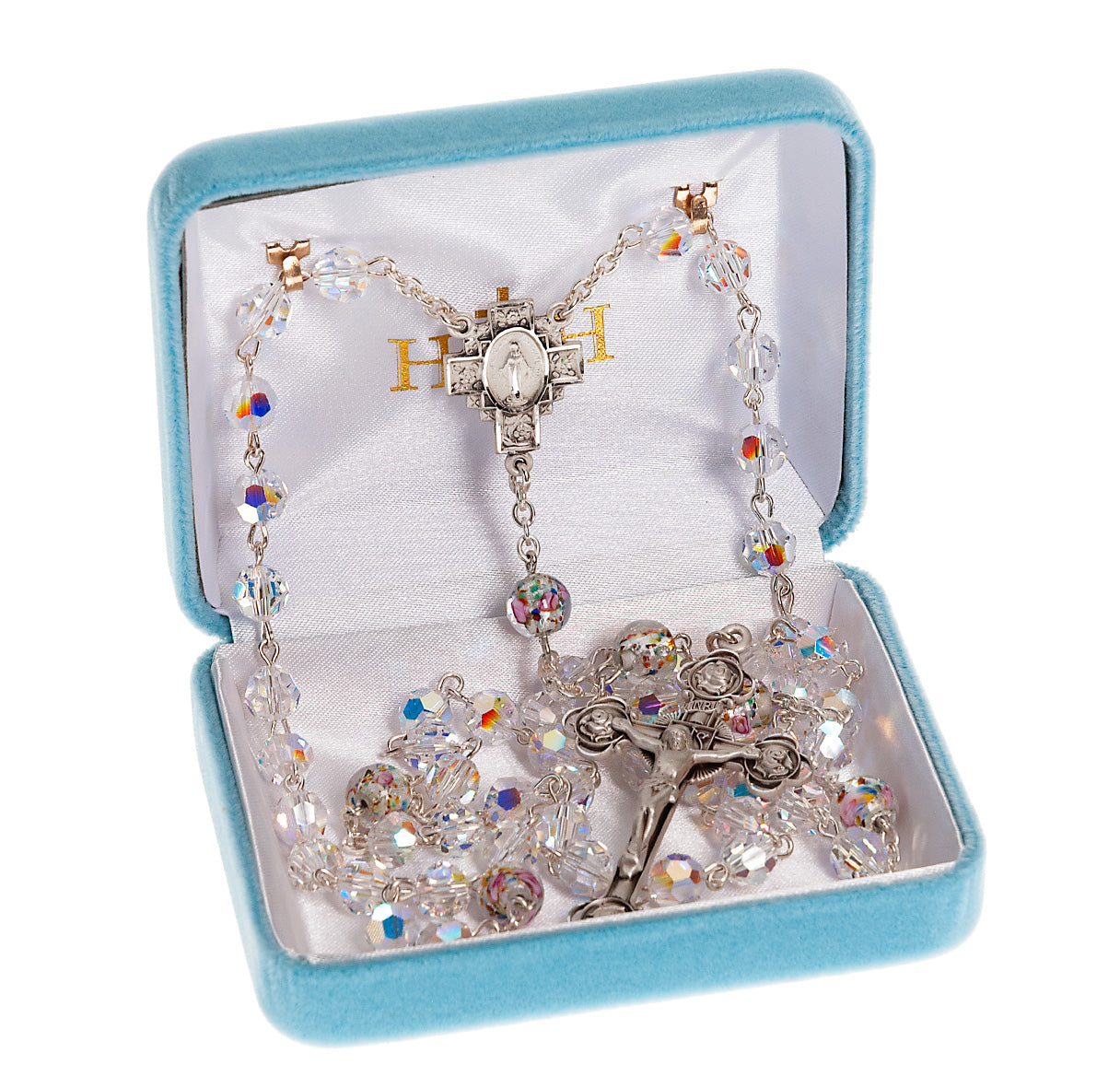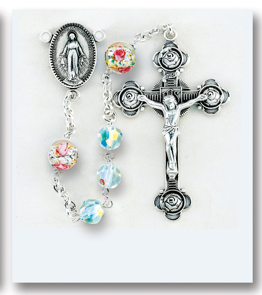 This 7mm Finest Austrian Crystal and Venetian Glass Sterling Rosary is made in the USA.