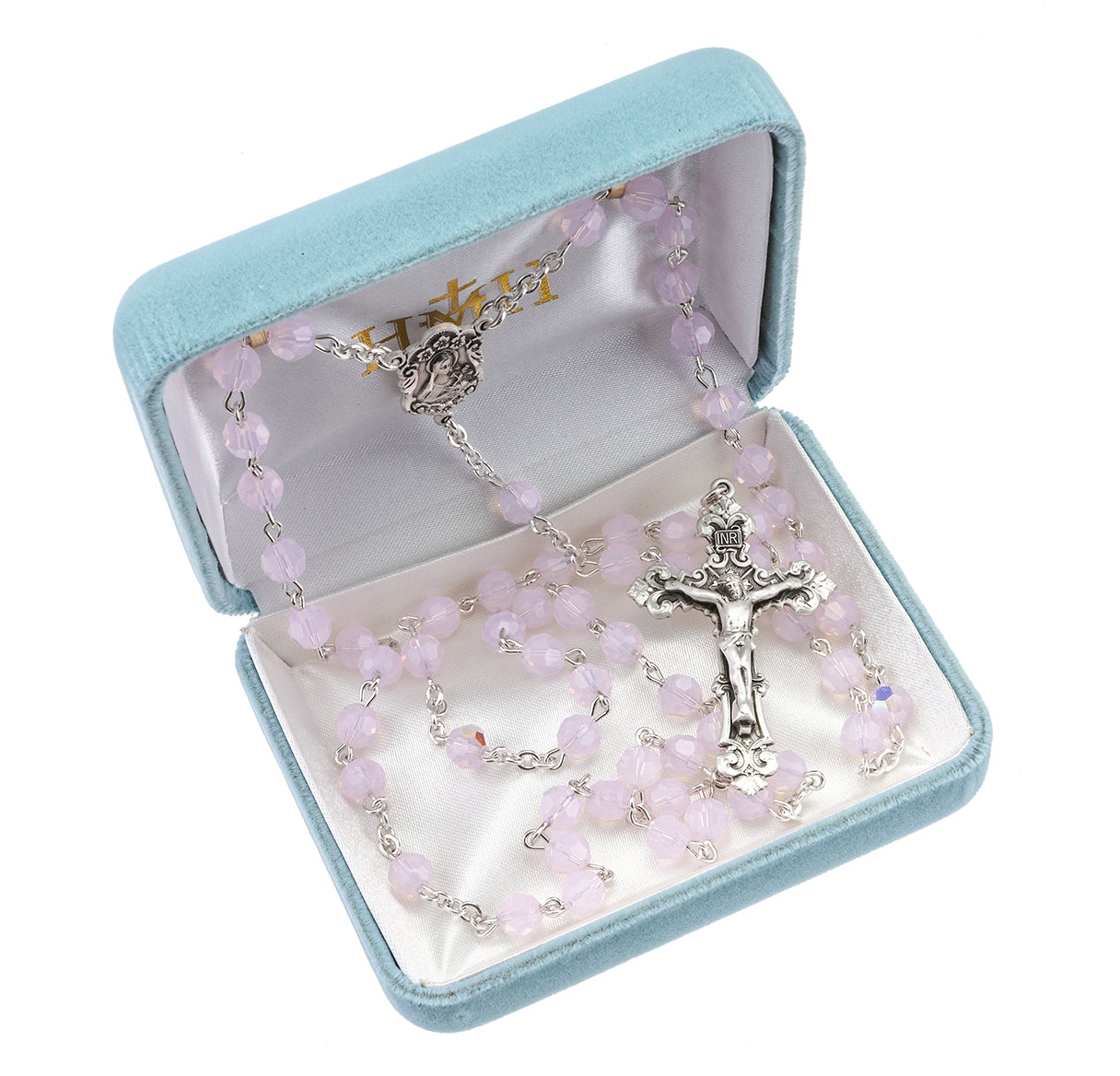 This Rose Opal Finest Austrian Crystal Rosary is made in the USA.