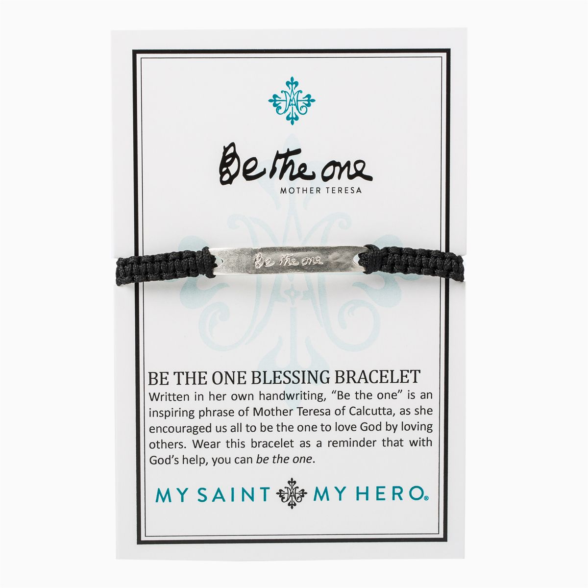 Handwoven in Medjugorje, Bosnia and Herzegovina, silver hammered bar engraved with the words “Be the one.” Medals made in Italy. This bracelet comes on cording with a sliding slipknot for an easy fit. 9.5” when fully opened. Be the One Blessing Bracelet comes on an inspirational card. BE The One Written in her own handwriting, “Be the one” is an inspiring phrase of Mother Teresa of Calcutta, as she encouraged us all to be the one to love God by loving others. Wear this bracelet as a reminder that with God’s help, you can be the one.