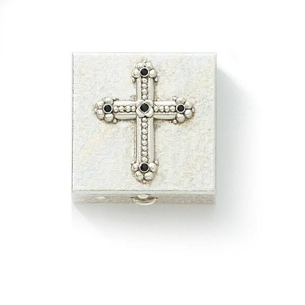 Our Silver-Tone Black Crystal Cross Pill Box from Symbols of Faith measures 1.5-inchL x 1.5-inchW x 0.5-inchH and comes in a deluxe gift box. With its small size, the box would hold a smaller rosary or other piece of religious jewelry.