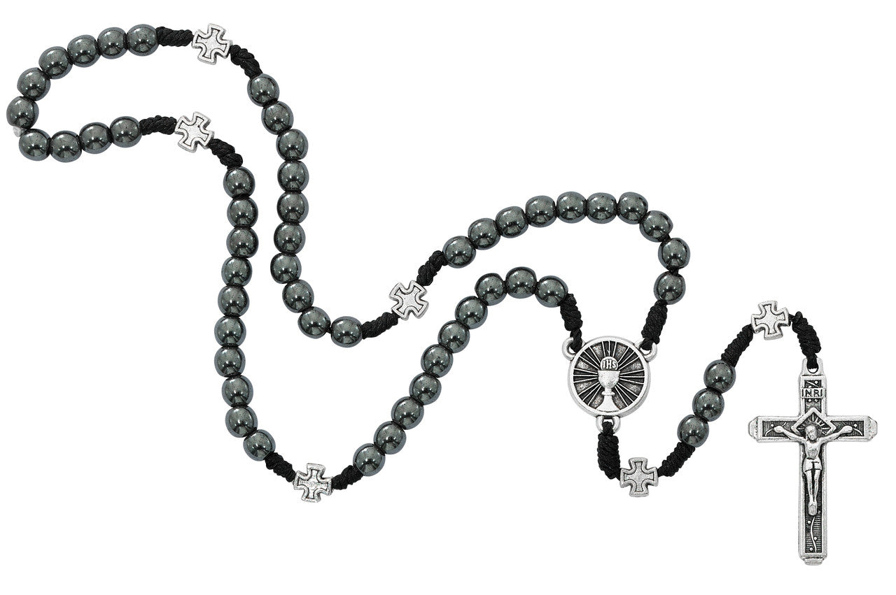 This 6mm hematite corded Sacred Heart centerpiece from McVan offers a beautiful foundation for creating a meaningful rosary or bracelet. The smooth, metallic-gray hematite beads provide a grounding, masculine aesthetic that appeals to those who prefer understated devotional items. Hematite, known for its polished silvery-black finish, creates a rosary that's both durable and dignified for daily prayer.
