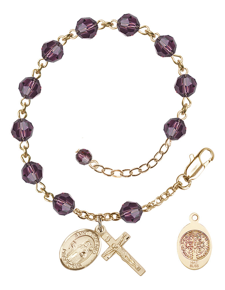 14kt Gold 6mm Austrian Crystal St. Benedict Rosary Bracelet in Amethyst | Engravable