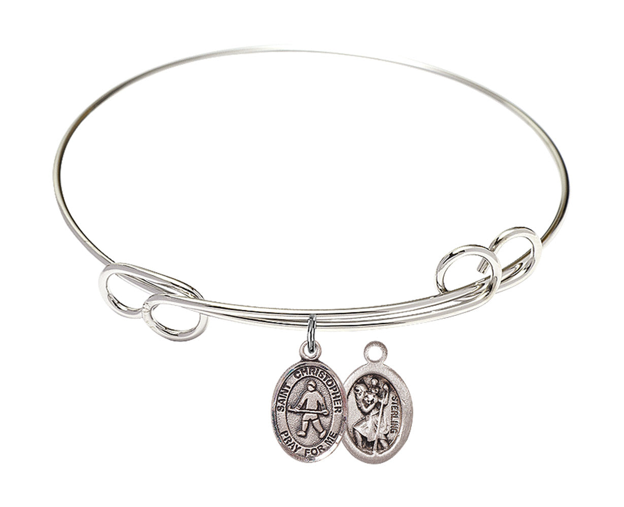 7 1/2 inch Round Double Loop Rhodium Bangle Bracelet with Sterling Silver St. Christopher / Field Hockey Charm