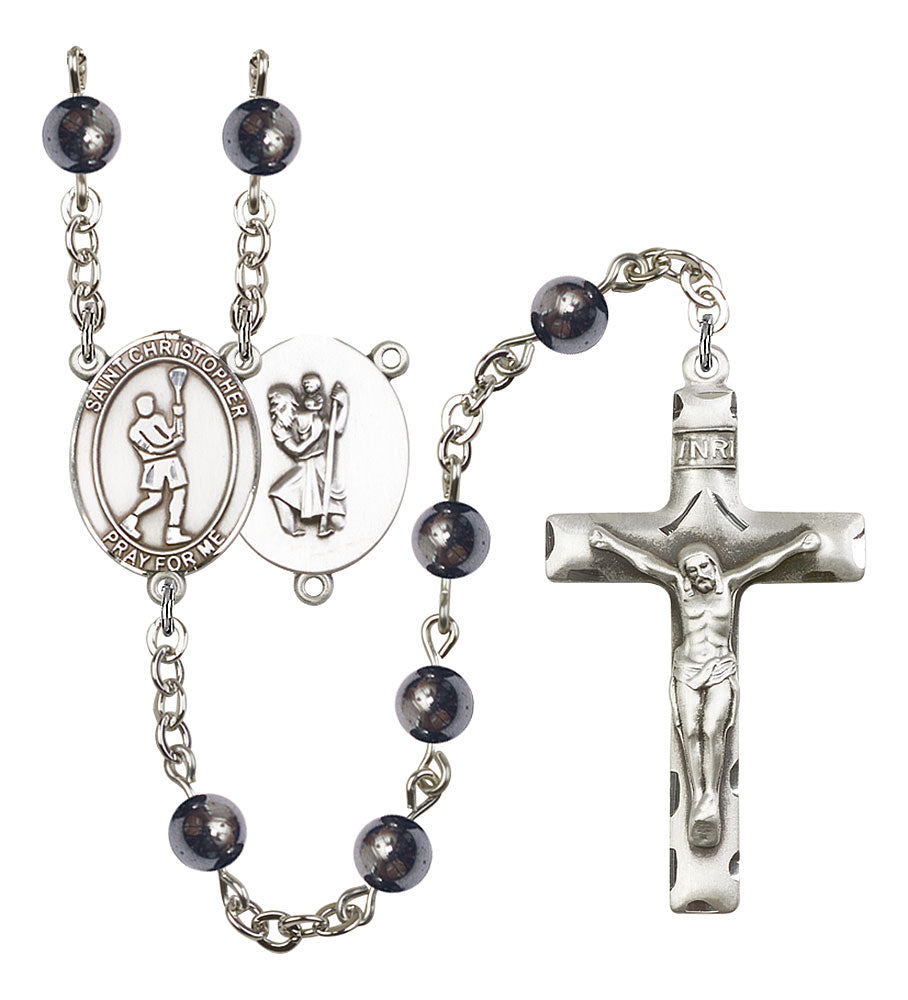 Saint Christopher and Lacrosse Rosary with 6mm Hematite Beads