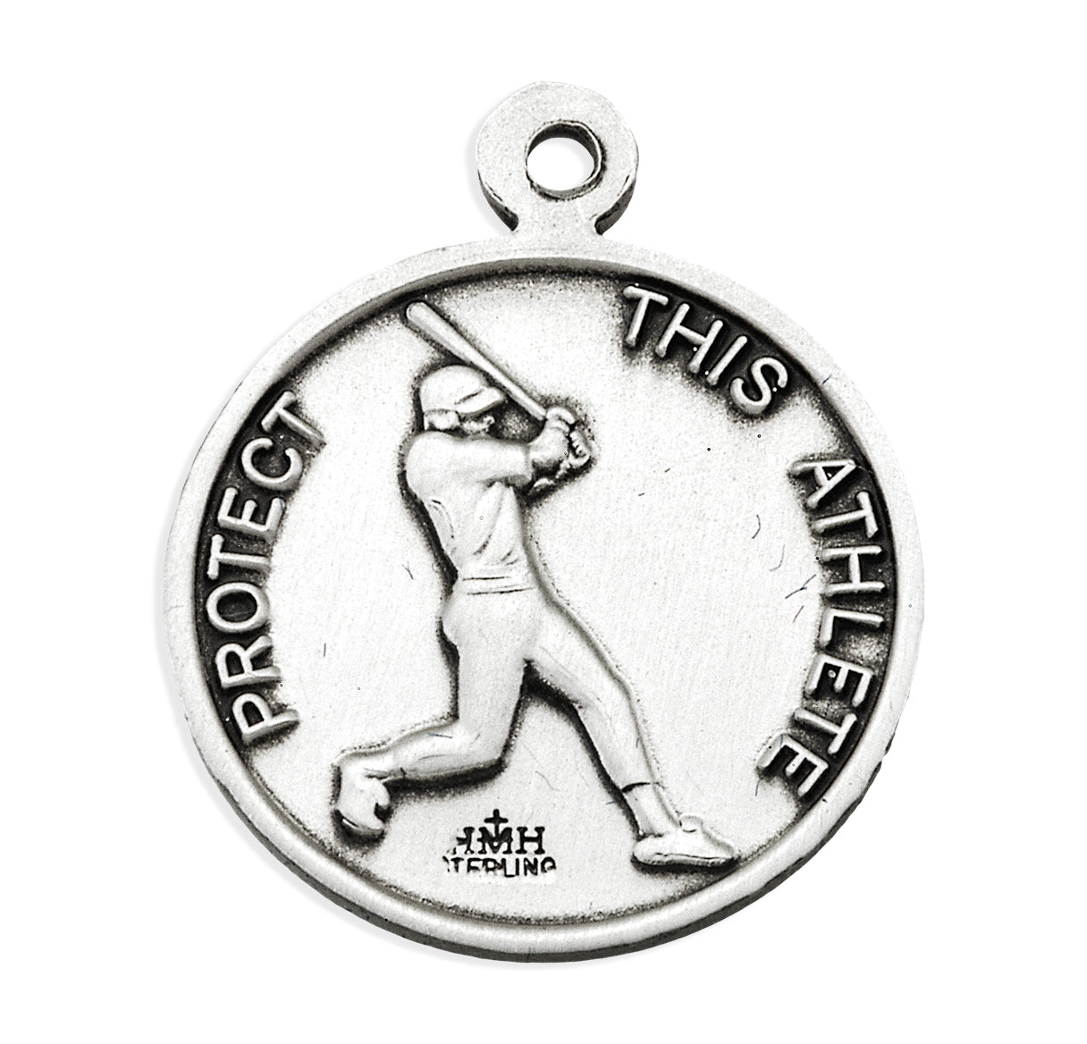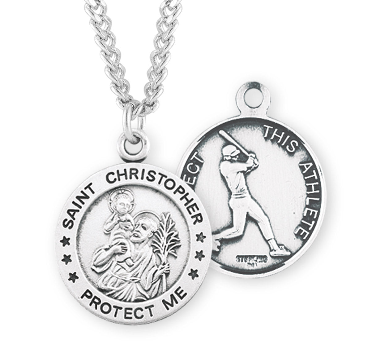 15/16-inch Sterling Silver St. Christopher Baseball Medal made in the USA. The Round Medal is adorned with St. Christopher carrying the Infant Jesus. The reverse side of the Medal Portrays a Male Baseball Player.