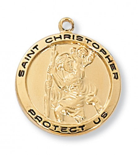 Embrace the protective grace of the Gold over Silver St. Christopher 18-inch Chain and Box . Crafted with gold over sterling silver , this stunning 3/4-inch St. Christopher medal serves as a constant reminder of his role as the patron saint of travelers. Each time you wear this beautiful piece, you invite St. Christopher's intercession for safe journeys and spiritual guidance.