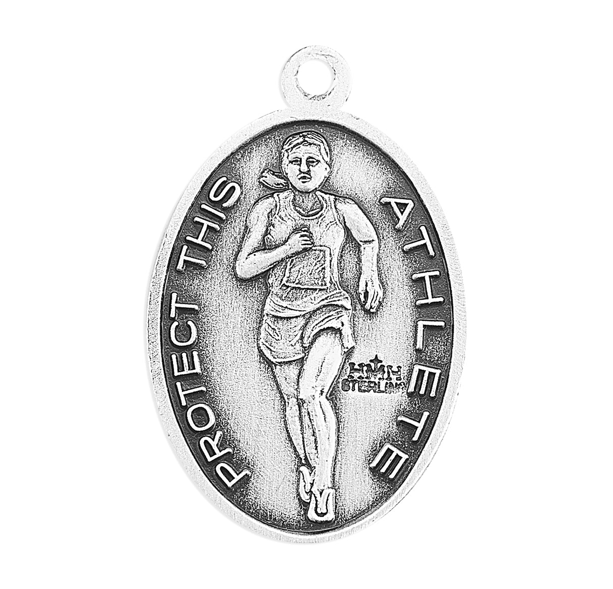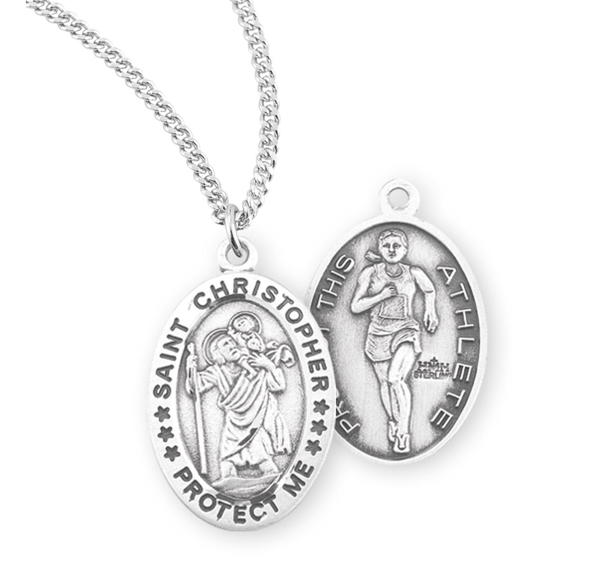 9/16-inch Sterling Silver St. Christopher Track Medal, made in the USA. The Oval Medal is adorned with St. Christopher carrying the Infant Jesus. The reverse side of the Medal Portrays a Female Track Runner.