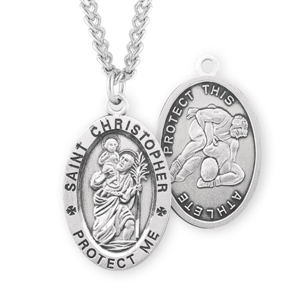 1-1/16-inch Sterling Silver St. Christopher Wrestling Medal, made in the USA. The Oval Medal is adorned with St. Christopher carrying the Infant Jesus. The reverse side of the Medal Portrays a Male Wrestler.