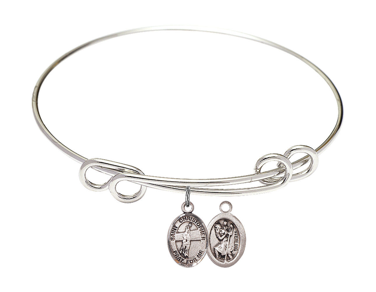Our 8 1/2 inch Round Double Loop Rhodium Bangle Bracelet with a Sterling Silver St. Christopher/Volleyball charm. is proudly manufactured in the USA.