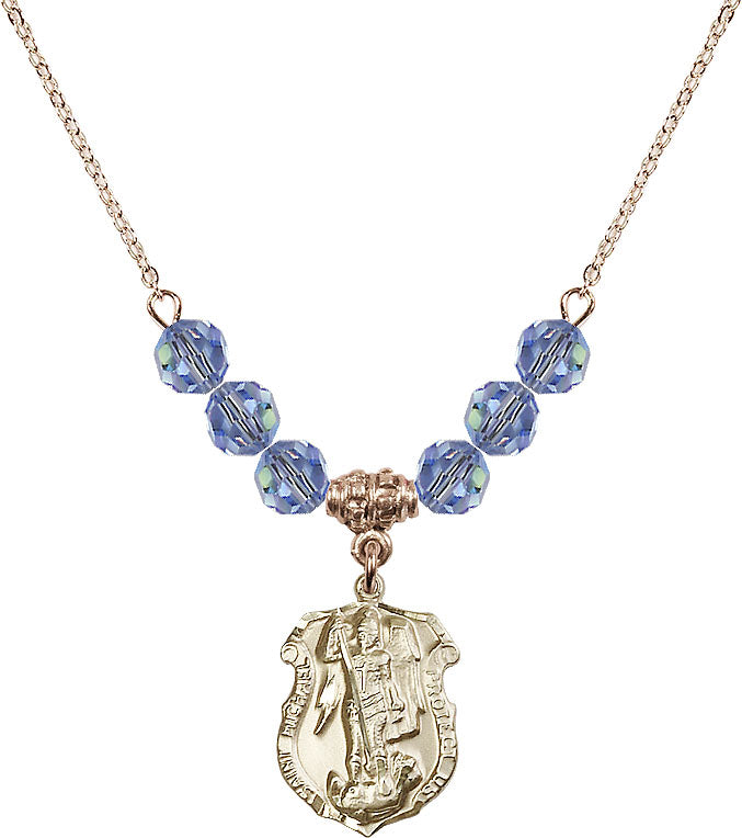 18" Plated Necklace with 4mm Light Sapphire Crystal Beads & 14K-Filled St. Michael the Archangel Medal | Engravable