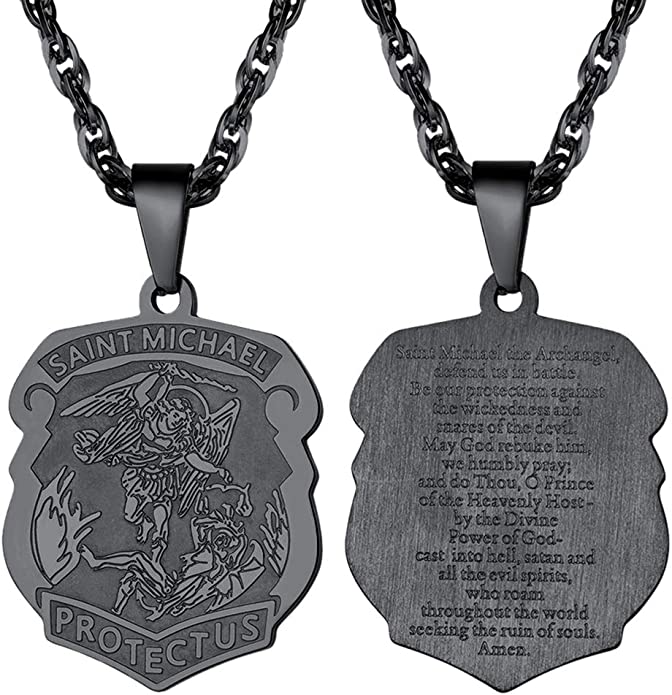 Our strikingly beautiful St. Michael the Archangel Badge Necklace is made of black gunmetal-plated 316L Stainless Steel.