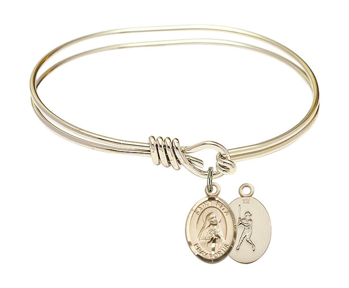 5 3/4 inch Oval Eye Hook Hamilton Gold Bangle Bracelet with 14kt Gold Filled St. Rita / Baseball Charm