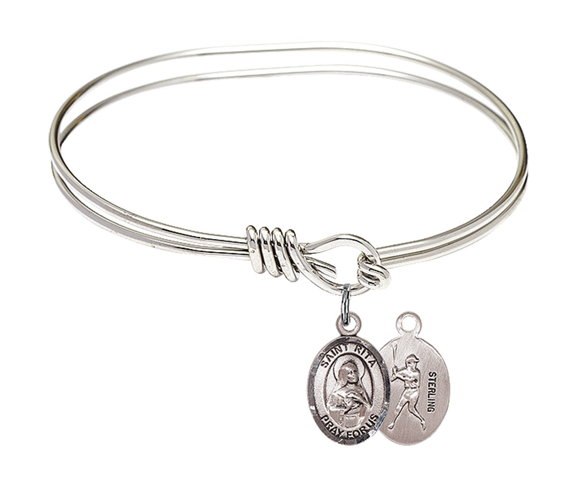 5 3/4 inch Oval Eye Hook Rhodium Bangle Bracelet with Sterling Silver St. Rita / Baseball Charm