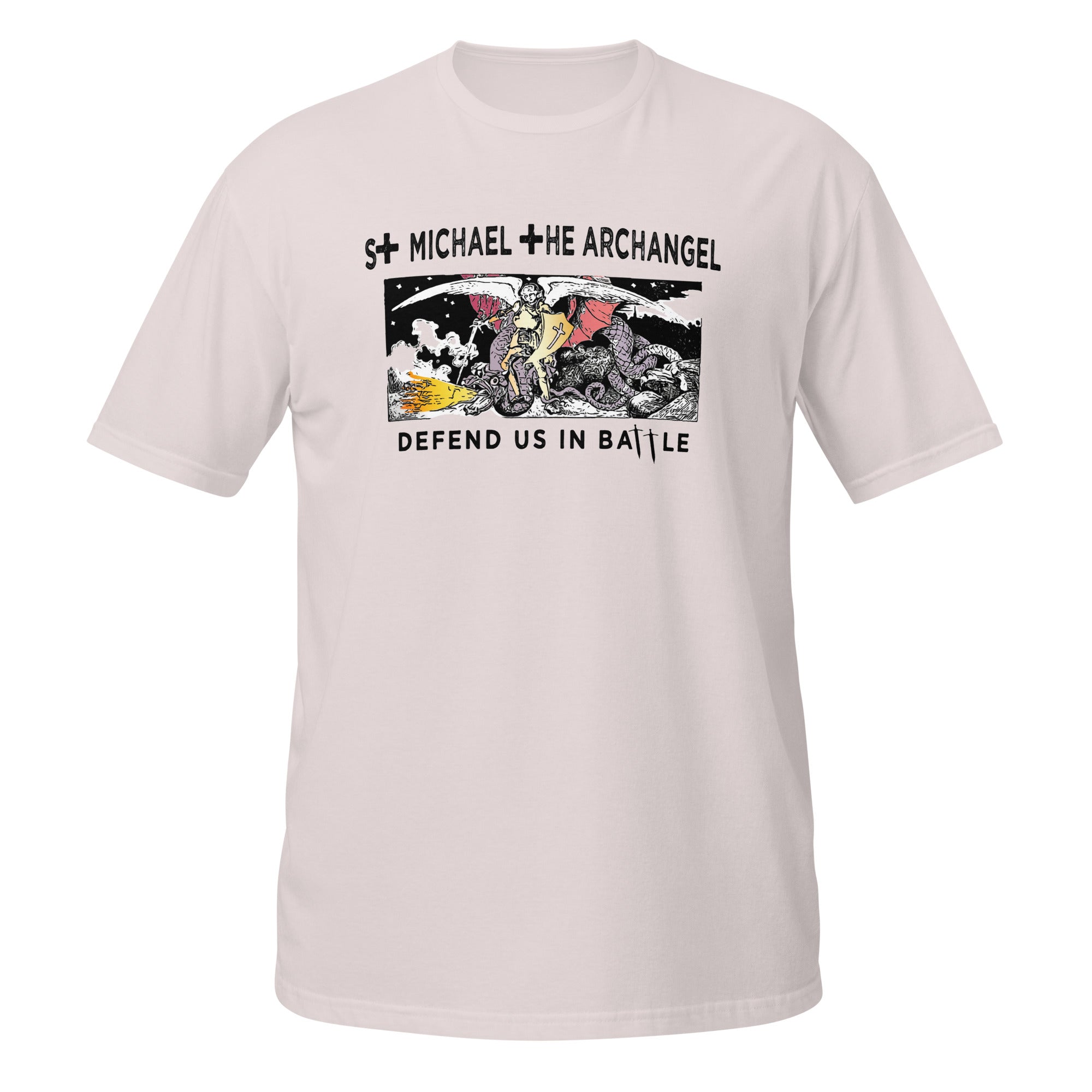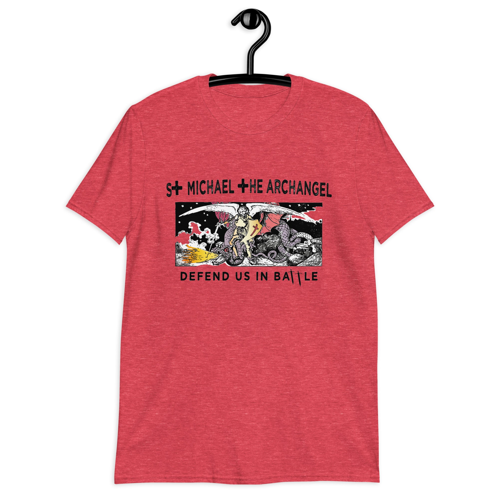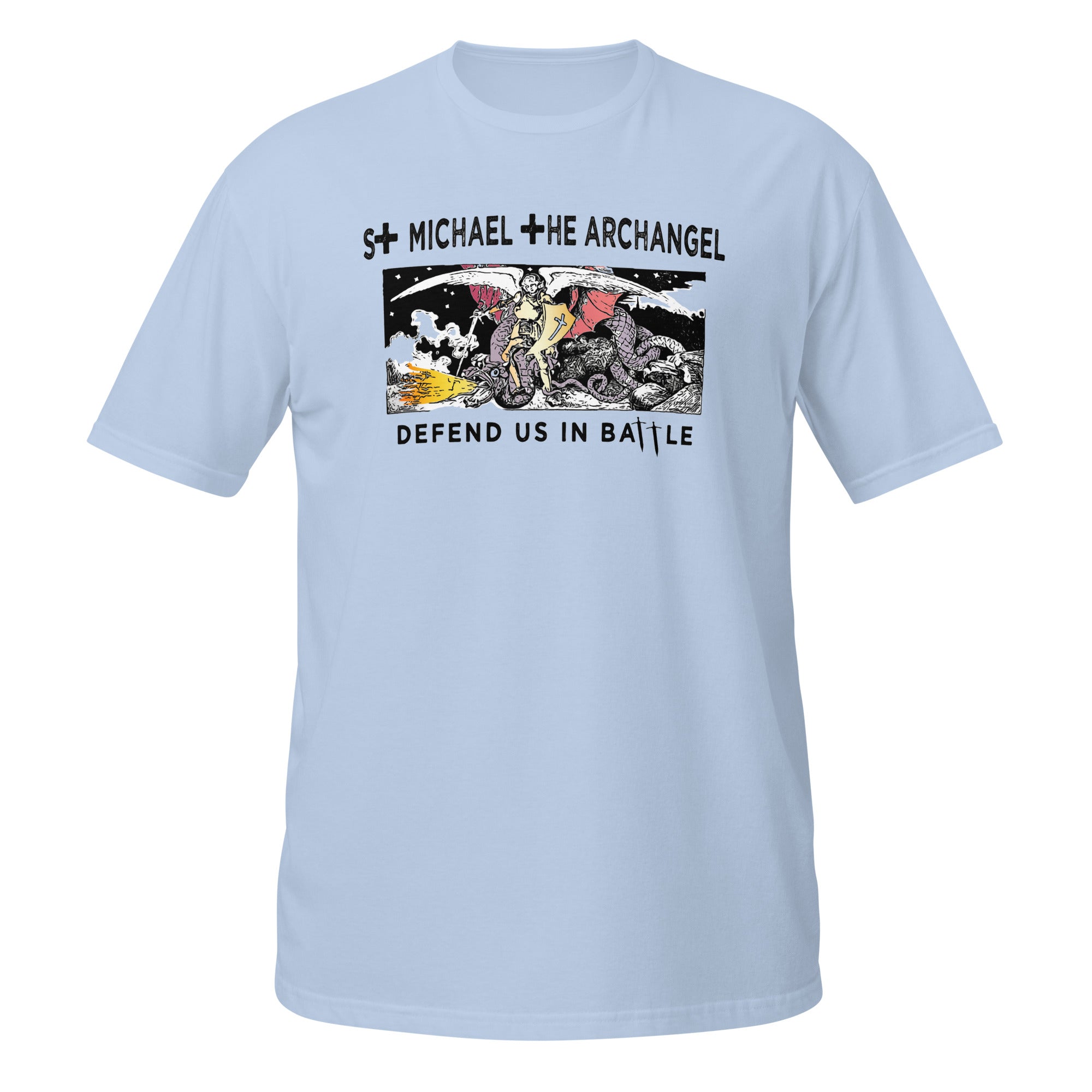 Our St. Michael Short-Sleeve Unisex T-Shirt features a stylish design by Apostle Gear and is made with a Gildan 100% ring-spun cotton shirt, making it soft and comfy. The double stitching on the neckline and sleeves add more durability.