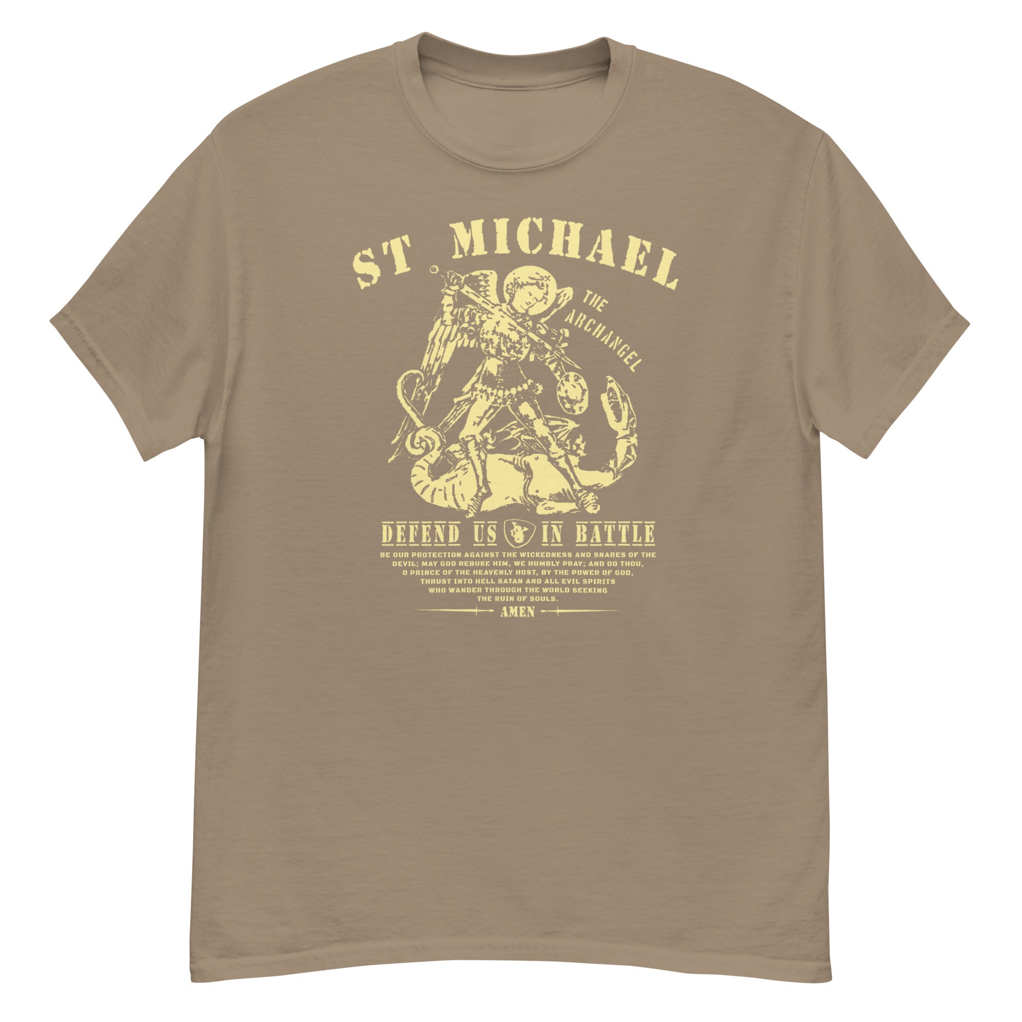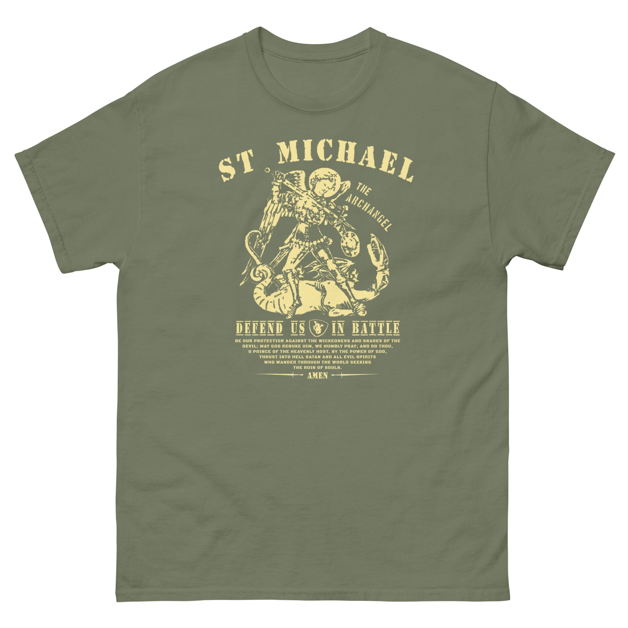 The military-green, 100% cotton Men's classic tee by Gildan offers a more structured look. It sits nicely, maintains sharp lines around the edges, and goes perfectly with layered outfits.