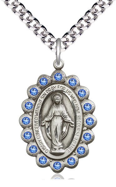 Pewter Miraculous Medal with Sapphire Swarovski stones | Large