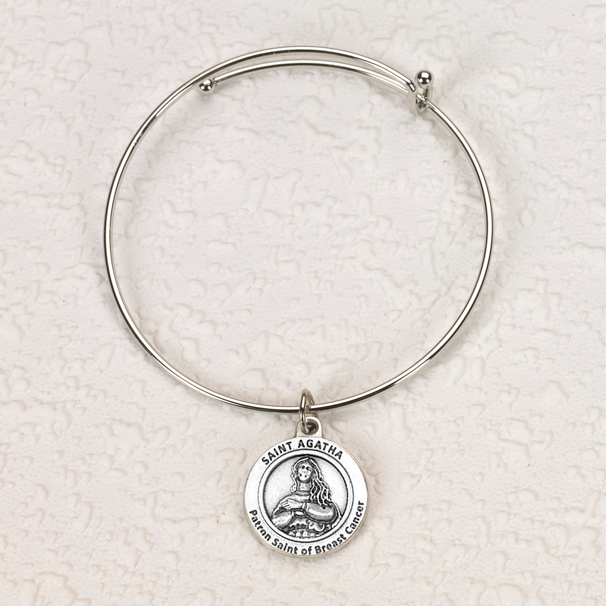 This set of four St. Agatha bangle bracelets offers meaningful support for those facing breast cancer or honoring survivors. St. Agatha, virgin and martyr of the third century, is venerated as the patron saint of breast cancer patients, offering her intercession and comfort during times of illness and healing. Each delicate bangle features her image and serves as a gentle reminder of faith and hope.