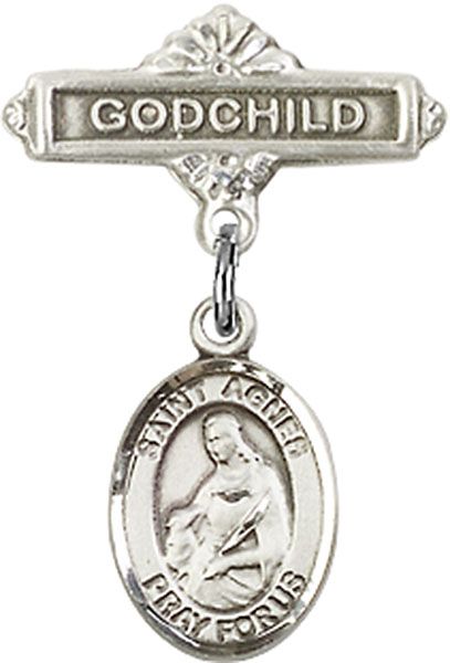 Sterling Silver Baby Badge with St. Agnes of Rome Charm and Godchild Badge Pin