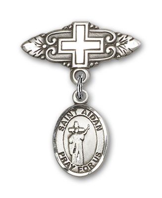 Sterling Silver Baby Badge with St. Aidan of Lindesfarne Charm and Badge Pin With Cross