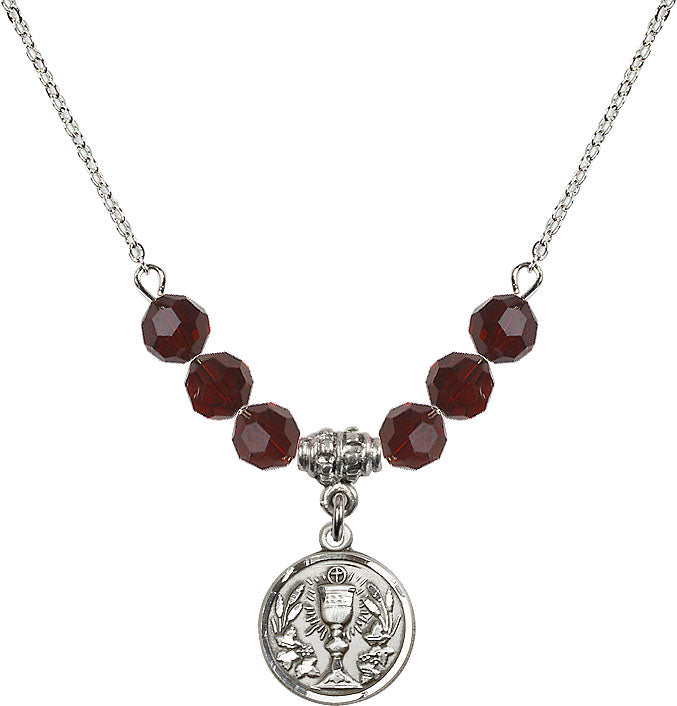 Our 18" Rhodium Plated Necklace with 4mm Garnet Crystal Beads featuring a Sterling Silver Communion Chalice Medal. is proudly manufactured in the USA.