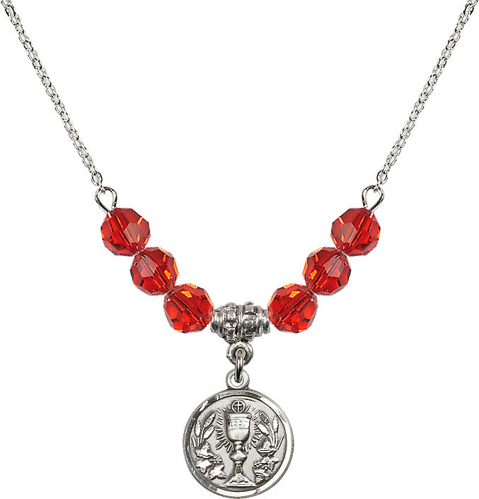 Our 18" Rhodium Plated Necklace with 4mm Ruby Crystal Beads featuring a Sterling Silver Communion Chalice Medal. is proudly manufactured in the USA.