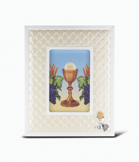 White Synthetic Leather Frame With Chalice is a beautiful way to display your cherished memories of faith. Measuring 8 inches x 10 inches, this frame fits a 4-inch x 6-inch photo and features a stunning chalice figure, symbolizing the Holy Eucharist and deepening your connection to the sacrament. Crafted from premium synthetic leather, it adds a touch of elegance to any space.