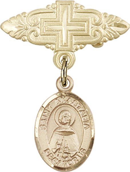 14kt Gold Baby Badge with St. Anastasia Charm and Badge Pin With Cross