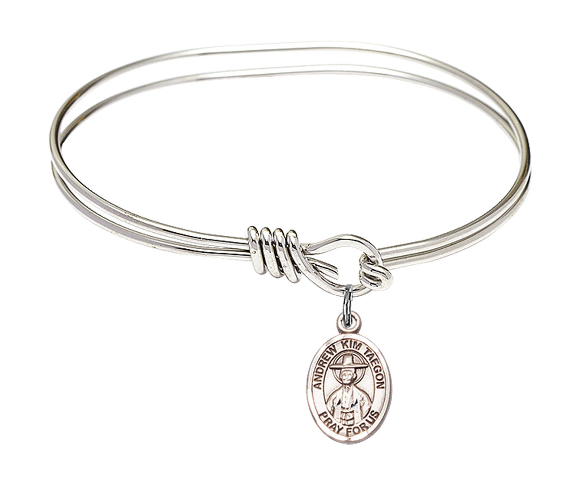 Our 5 3/4 inch Oval Eye Hook Rhodium Bangle Bracelet with a Sterling Silver St. Andrew Kim Taegon charm. is proudly manufactured in the USA.